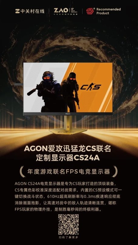 游戏联名:深度定制致敬硬核竞技 荣获“年度游戏联名FPS电竞显示器”奖项的AGON迅猛龙CS联名定制显示器CS24A,将“游戏联名”的情怀与“FPS电竞”的专业需求完美融合,为每一位渴望在对抗中占据先机的玩家提供真正职业级的设备支持。其核心优势在于拥有610Hz超高刷新率与0.3ms MPRT极速响应时间,能够彻底消除画面拖影与撕裂,确保选手操作精准流畅。同时,其搭载的暗场控制功能、Adaptive-Sync防撕裂技术等专业配置,全面满足职业赛事对显示设备的严苛要求。除性能之外,CS24A还提供深度CS定制体验:专属人机控制器一键切换CS模式,官方授权OSD内置多场景预设参数,让玩家无需复杂调校即可快速进入最佳竞技状态,凸显其专业级FPS联名装备定位。从完美世界CS全国联赛(PNL)、2025完美世界CS挑战赛(PWC)到2025年反恐英雄亚洲邀请赛(CAC 2025),CS24A均被选为官方指定比赛用机,在多项顶级CS赛事舞台上持续亮相,为其专业级性能与稳定表现提供了最有力的实战背书。